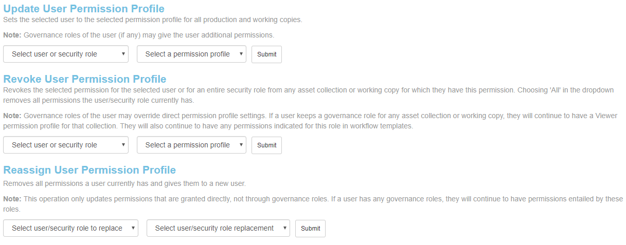 Administrators can assign or revoke either individual users or their security roles to viewer, editor or manager profiles for any or all collections, along with their working copies.