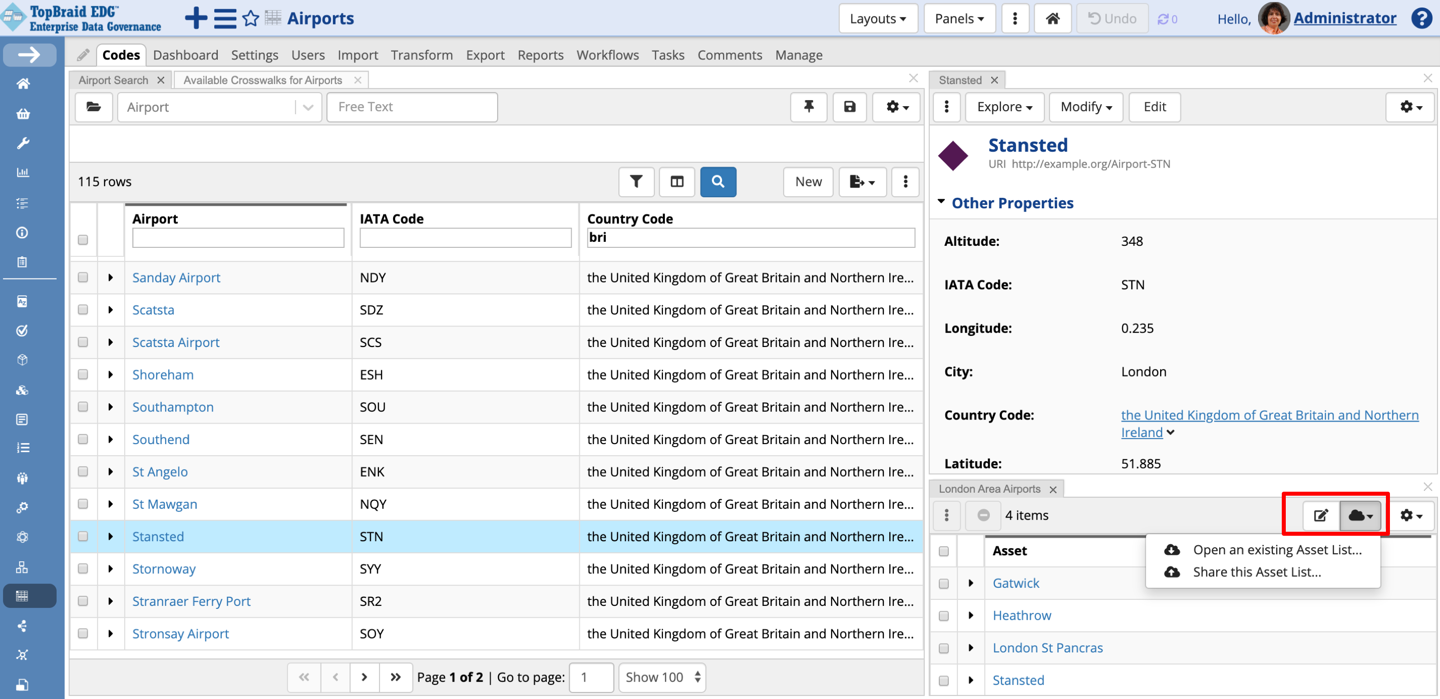 For example, let’s select some London area airports and drag and drop them into the Asset List panel. Click on the pencil icon to name the asset list. Now click on the cloud icon to the right of the pencil to share the asset list. Shared lists are saved to the server. Other users can then download the list you created and shared.