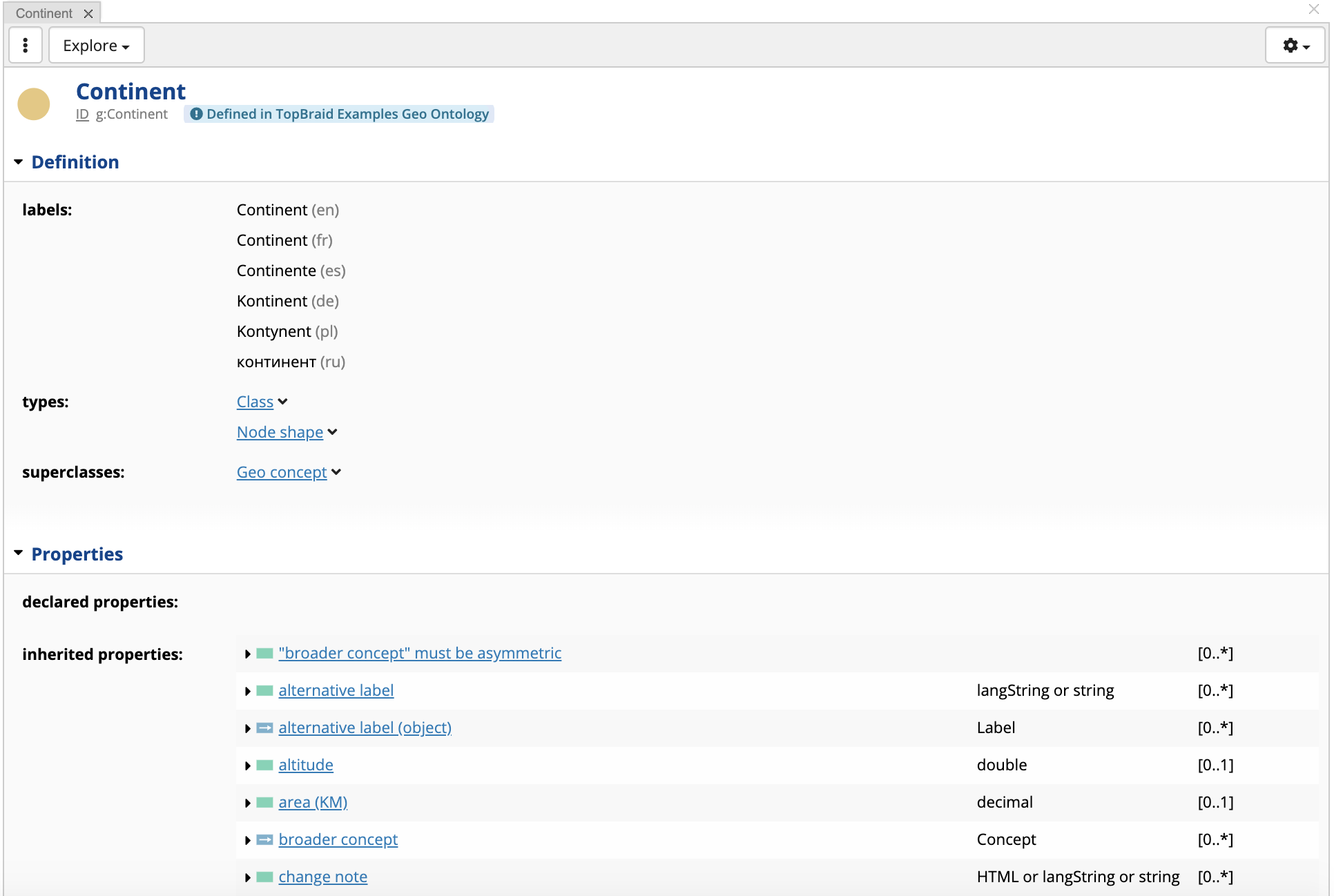 SKOS defines a class (entity type) Concept together with a number of properties (attributes and relationships) that describe concepts. You already seen them when you worked with Geography Taxonomy. For example, preferred and alternative labels and broader relationship between concepts.