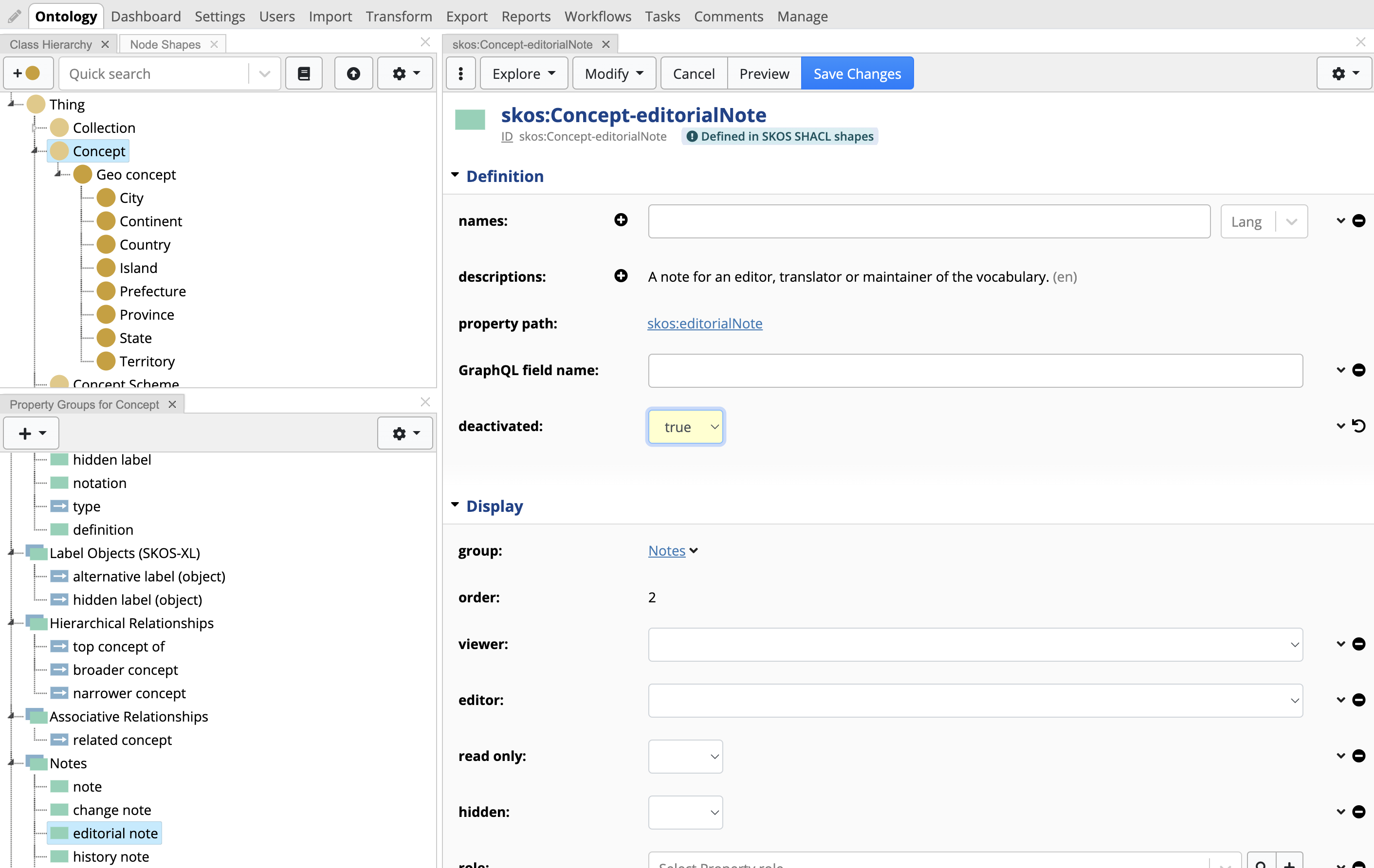While editing, you may have noticed that there are a lot of fields (properties) available for concepts. Many of these come from SKOS. You may not want to use all of these properties in your taxonomy. While you can’t delete SKOS properties, you can disable them. To remove (disable) some of the fields for Geography Taxonomy or any other taxonomy that uses Geography Ontology, click on a property you want to disable e.g., editorial note.