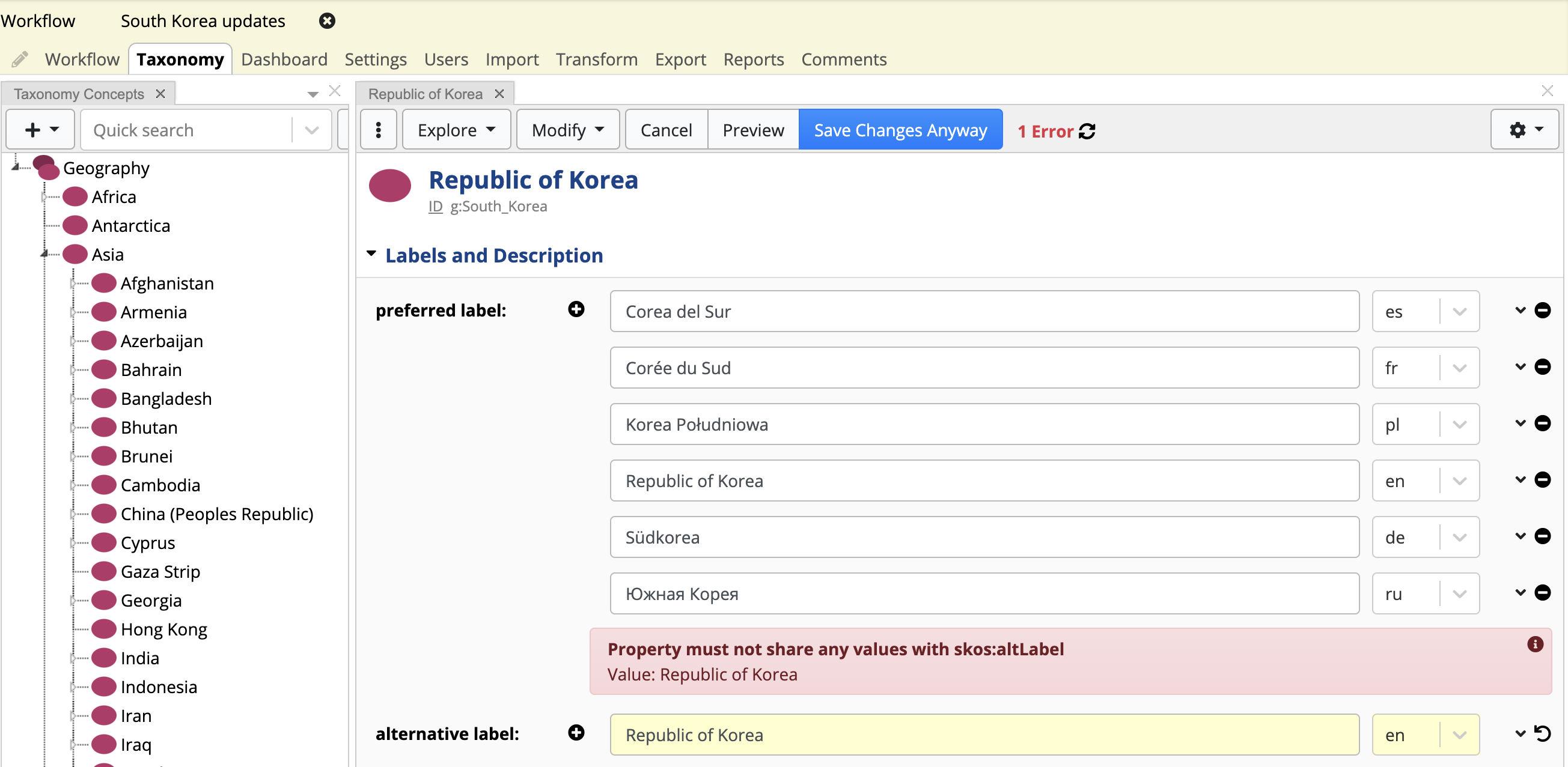 Click the Taxonomy tab and check Asia’s child concepts again. You will see that the Republic of Korea is there instead of South Korea, and it will have Busan as its child along with Seoul.