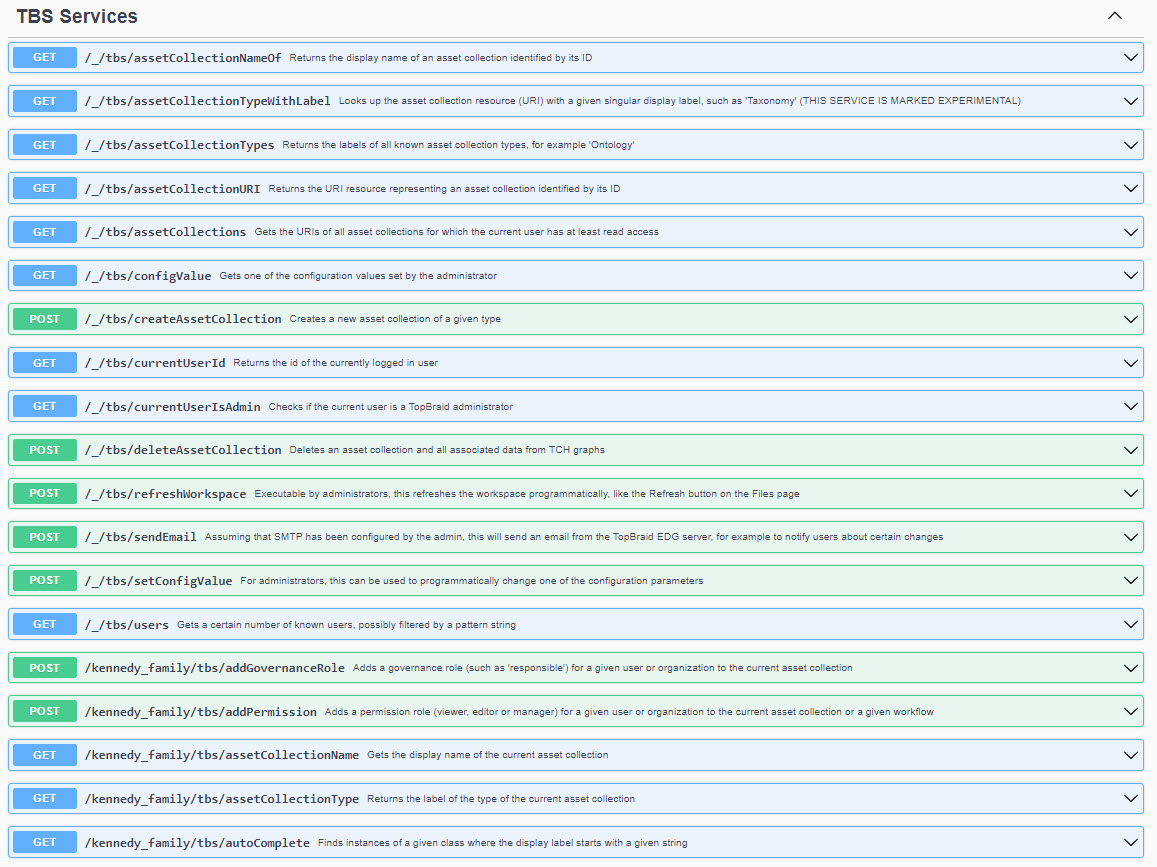 API endpoints can be accessed by any user of TopBraid EDG. Users will only be able to access asset collections they have access rights for. Users will only be able make updates to the asset collections they have rights to perform updates for.