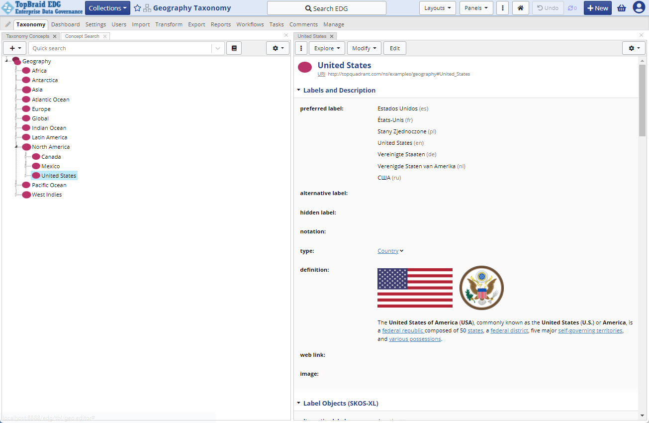 The following screenshot shows edit mode when a concept in a Taxonomies collection is selected.