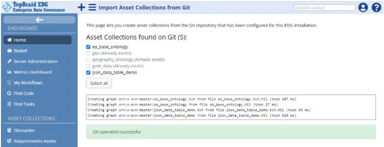 To use, set parameters on the EDG Configuration page. Note, Git integration requires a local folder on the server that connects to a git repository.