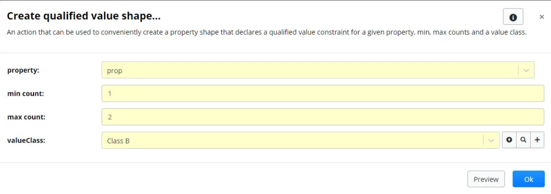 These constraints allow users to specify conditions that only a certain number of values of a given property must meet. For example, at least 1 and no more than 2 values of “prop” property must be members of Class B, while other values of “prop” can be members of other classes. Prior to 7.1 such constraints could only be defined using the Source Code panel.